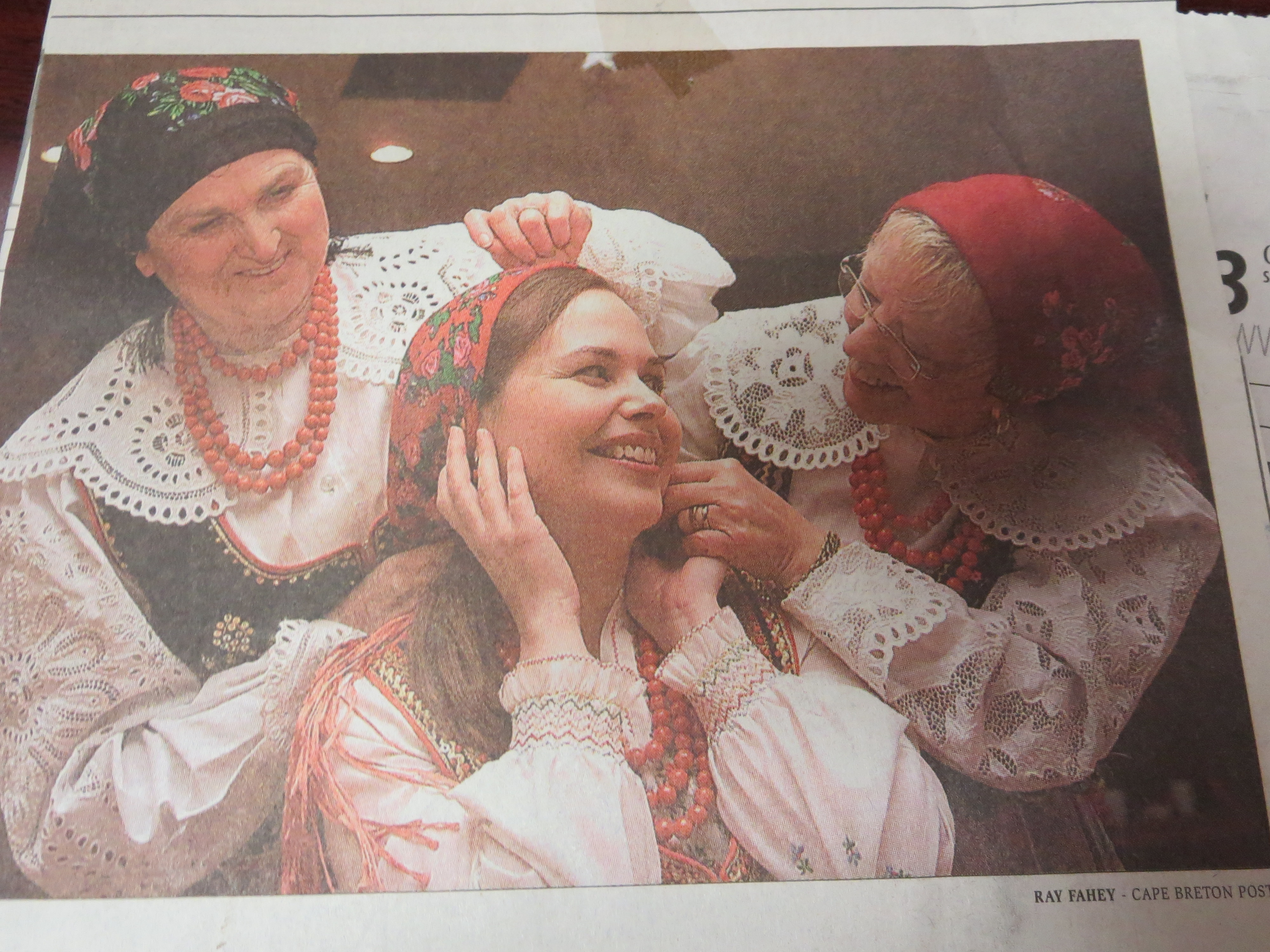 A photograph of three women from St. Mary"s Polish Church wearing traditional dance costumes.